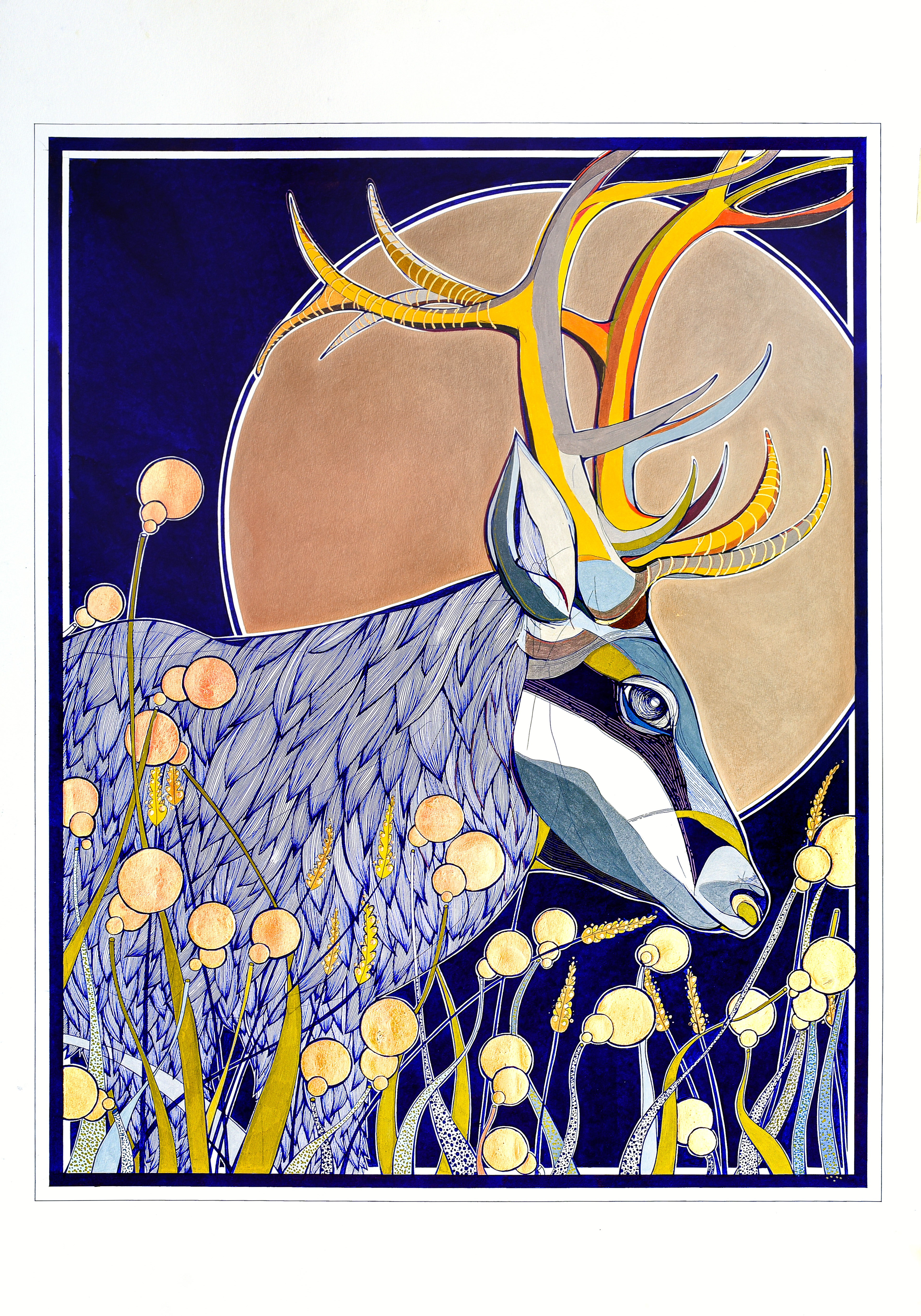 This one didn’t arise organically. It was suggested to me and I’m appreciative I accepted the prompt. We struggled for a good while pretty much. He did not conceive of giving in and just emerging off of the page. What was that about artists and the luxury to set forth problems for consideration only to subsequently find the solution in creation? Tall-fucking-order! Well…this Lunaticus is framed by “are those mushrooms?” aka floating ghost lights aka orbs. Yes, he occasionally consumes mushrooms and berries. I guess that’s where the antiquated lunatic part might show its gold-wrapped horns. He loves wandering in the forests, grunting and listening to The Body.